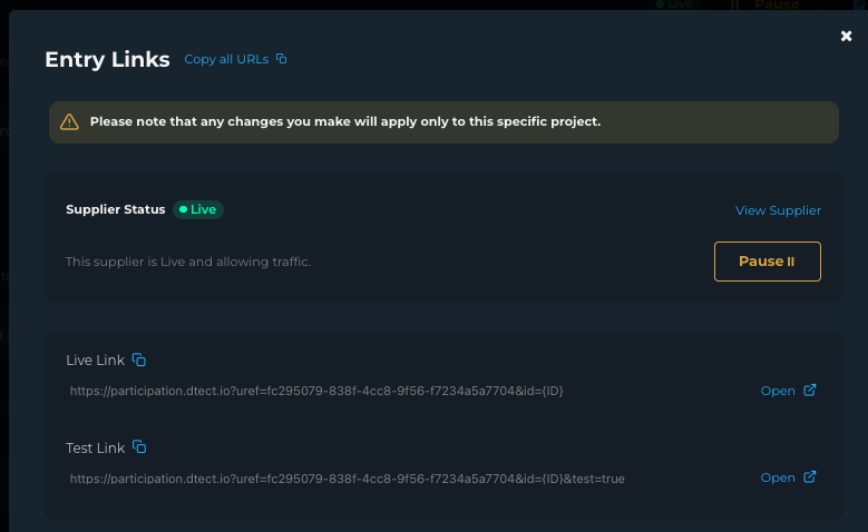 After adding a supplier to a project (see Add a Supplier to a Project) you'll be able to click "Edit" on the supplier in the Redirects page to see that supplier's entry links. Every entry link is specific to a supplier, you can't use the same entry link for different suppliers.