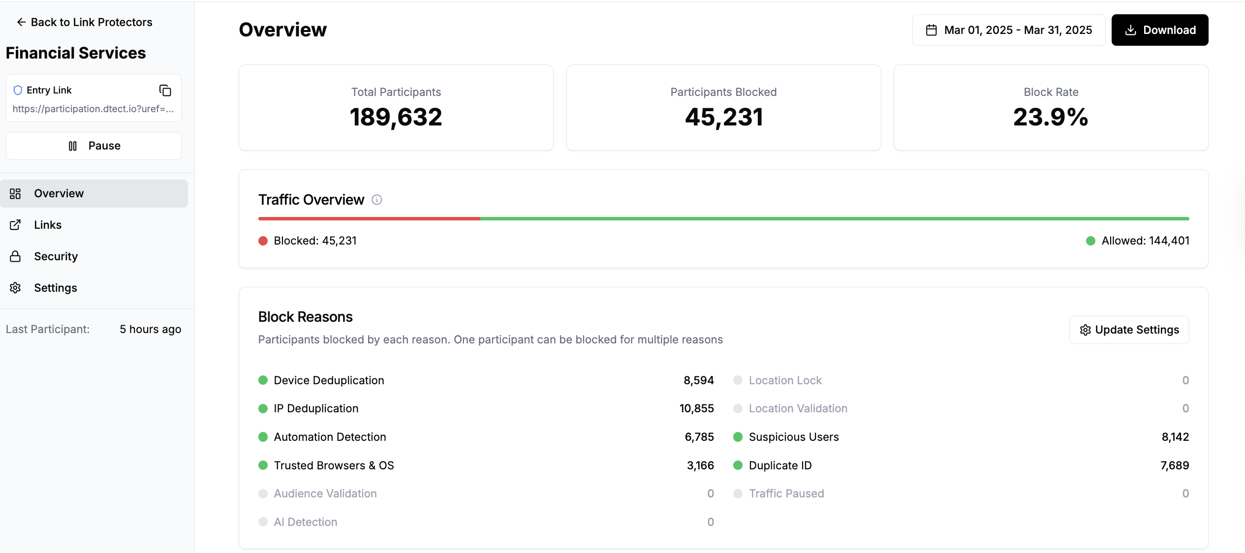The Overview tab provides a snapshot of your Link Protector’s performance, including total participants, number and percentage of blocks, and a breakdown of block reasons.