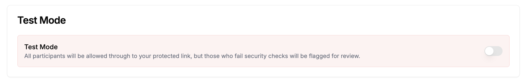 Test Mode allows all participants to continue to the protected link even if they fail security checks.